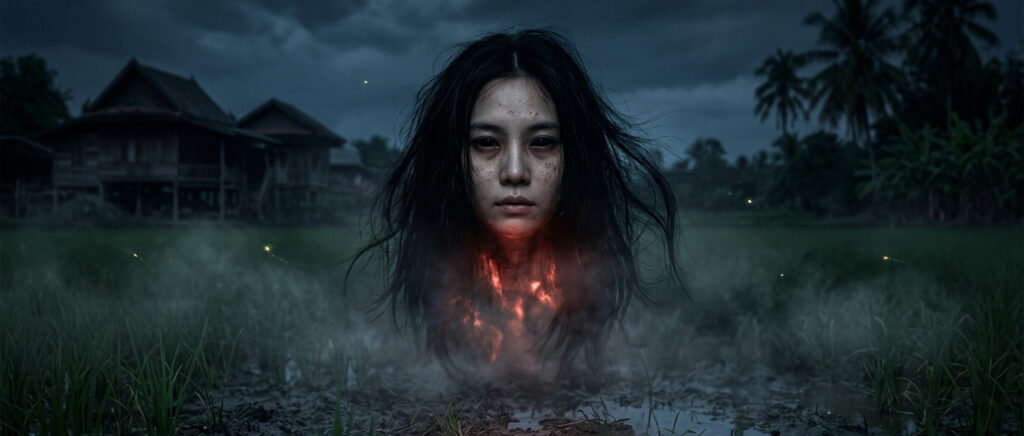 Eso es la Krasue. Y en Tailandia, Camboya, Laos y partes de Malasia, no es solo una historia para asustar niños. Es una advertencia sobre lo que le ocurre a ciertas mujeres cuando la oscuridad cae — y una de las criaturas más perturbadoras del folclore asiático por una razón muy concreta: a diferencia de la mayoría de los monstruos, la Krasue tiene cara humana. De día es tu vecina. De noche es otra cosa.